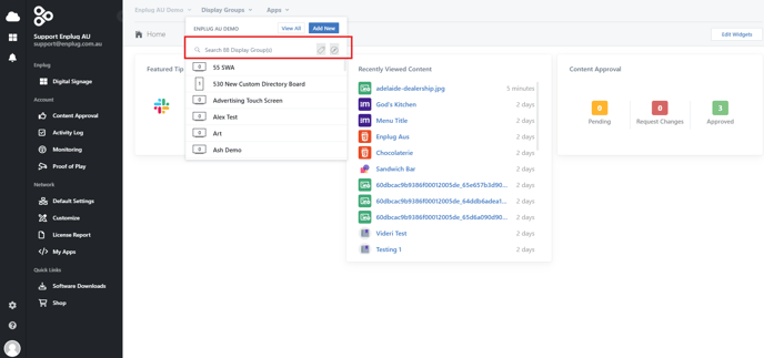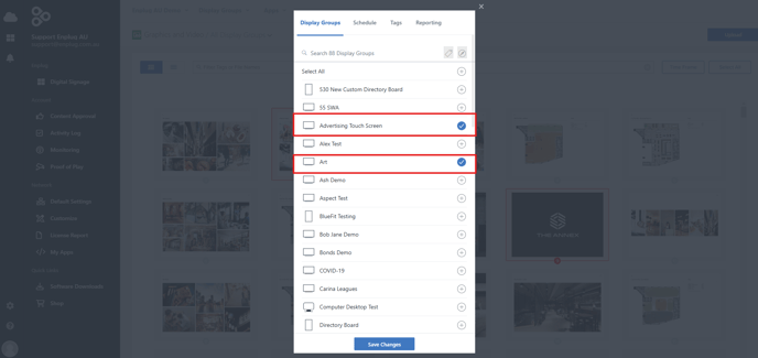 4. Search for your desired display group and press the plus button. This is the display group that you want the content to play in. Please note you can press more than one display group.