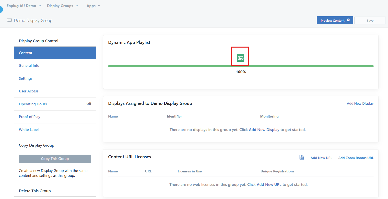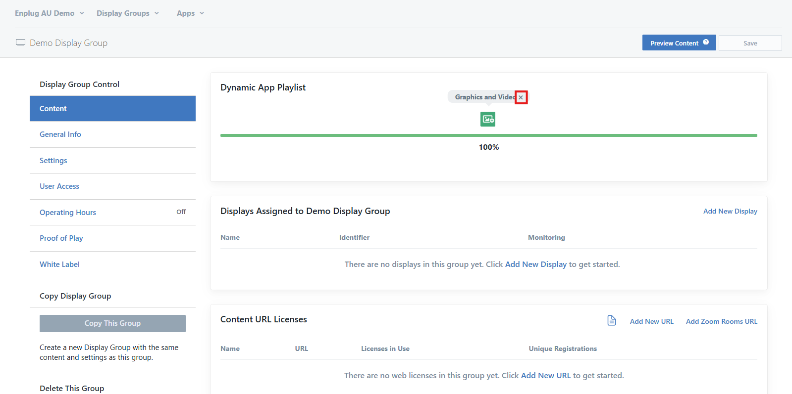 Please note that if you want to make the application as whole inactive from the display group there is a little 'x' button that can be pressed when hovered over the icon. Pressing this will deactivate all content assigned to this display group in the application.