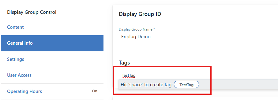 3. In the "Tags" text field, type whatever tags you would like to use to distinguish your display group. You could tag based on location, content type or audience.