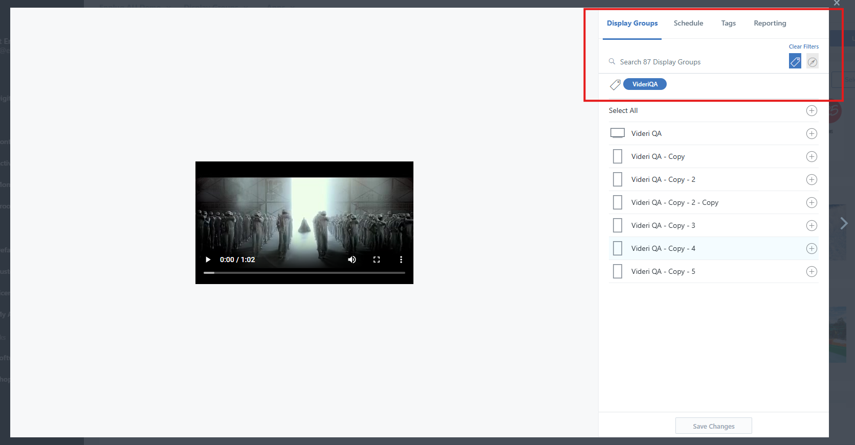 1. During the steps to apply content to a display group, search for all tags by clicking the "Tags" button. By clicking on a specific tag you want to filter by it will immediately filter your list of display groups to only ones using that tag.