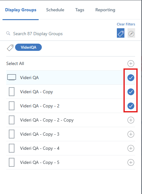 2. Now it is much easier to assign the content to these filtered display groups. To do so press the plus icon to next to each display group to assign it to them. Alternatively if you are assigning the content to ALL filtered content you can select all.