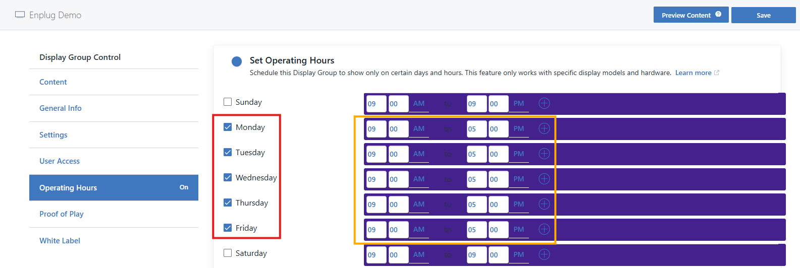 2. Navigate to the Operating Hours within the Display Group.